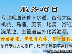 6.下水道疏通——能快速准确疏通下水道的堵塞. 我公司自成立以来,为广大客户排忧解难,一直受到用户的好评。我们将再接再厉,勇于创新,增强员工职业道德素质培养,使公司服务再上一个新台阶。 可与物业、单位、公司、社区、学校、餐厅、个人长期优惠承包。本广告长期有效随叫随到,无节假日,全年服务。