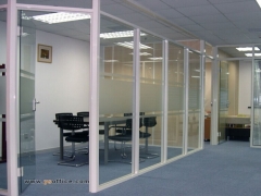 办公室玻璃隔断的特点:采光性好,隔音、防火性能佳,环保且容易安装,可重复利用,免维护。 单玻隔断即单层玻璃隔断,其基本结构是由单层玻璃和铝金属型材构成的隔断墙体,空间性好,成本较低。 双玻隔断即双层玻璃隔断,其基本结构是由双层玻璃和铝金属型材构成的隔断墙体,牢固耐久,整体感更强,且双层玻璃中间加入各式百叶,可实现更多效果。