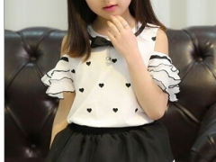 2015新款甜美女童爱心花边露肩短袖短裙两件套