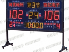 两队名称显示、比分、比局、场次、犯规次数、发球权显示、比赛时间、24秒计时、暂停次数、交换场地、暂停指示等显示内容。比赛时间可在1-90分钟内任意设置,24秒计时可1-99秒任意设置,计时到零有声光警报功能。比分最高可记199分。可以进行加减分作操。篮球计时可另配手柄单独操作,这样可两人分别操作计时器和比分方便快捷,并可与外部篮球计时器连接实现完全同步计时功能(以上功能可按用户需求订制)。