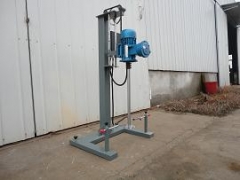 机,调速由变频器控制,整机升降通过链条及手摇方式,叶轮为直接螺纹拧紧在分散轴底部,大小可以选择以适应不同容量的搅拌筒,机身下方有搅拌筒抱紧装置,底部可根据需要装配移动轮脚,可移动至不同工作场所。