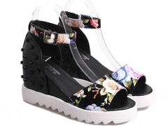 里料材质: PU品牌: 自主品牌货号: 紫翔-03上市年份季节: 2014年夏季帮面材质: PU皮质特征: 印花鞋底材质: 聚氨酯鞋头款式: 鱼嘴后跟高: 低跟(1-3cm)跟底款式: 坡跟流行元素: 铆钉 坡跟 防水台颜色分类: 白色 黑色尺码: 35 36 37 38 39