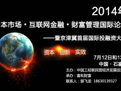 《2014年资本市场?互联网金融?财富管理国际论坛—暨京津冀首届国际投融资大会》将在7月12日和13日火热召开,史纪良、范剑平、李建良、阚治东、王卫华、郑锦桥、黄震、韦洪波以及国际家族基金会创始人等将亲临现场,为您呈现全球化视野,实现投融资双方“大数据分析”和“平台化对接”。本次论坛荟萃1000余名企业领袖、300余家国内外金融机构、100余位业界名流、10余家最具影响力的协会组织。盛况空前,敬请莅临!