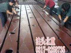 划线平台/铸铁平台按GB/4986-85标准制造,划线平台制成筋板式和箱体式,工作面有长方形,材料HT200,工作面采用刮研工艺,工作面上可加工V型、T型、U型槽和圆孔、长孔等。铸铁平板是用于工件检测或划线的平面基准器具。平板安装应调至水平、负荷均分布于各支点上,环境温度使用时应避免振划线平板(平台)的用途: 是检查机器零件平面度,直线度等形位公差的测量基准,也可用于零件划线研磨加工,安装设备等用途。是检验机械零件平面、平行度、直线度等形位公差的测量基准,也可用于一般零件及精密零件的划线、铆焊研磨工艺加工及测量等。 划线平台的生产工艺流程基本是: 一、铸铁平板毛坯:按技术要求制图纸、按图纸制作模型、配料、造型、烘干、浇铸、落沙、清理、检验毛坯的各部位;热处理毛坯,时效处理,其目的是降低铸件内部的应力,防止机械加工后的变形。 二、铸铁平板机械加工:外观检验并划线、加工、检验; 三、铸铁平板工件调平、人工刮研、检验科检验; 四、铸铁平板的外观处理、喷漆、包装、入库。 铸铁平板的精度也可以说是铸铁平板的平面度:铸铁平板一般精度可以分为0级、1级、2级、3级。铸铁平板的精度标准在《中华人民共和国机械行业标准》JB/T 7974—2000里可以查到。选用精度标准时一般根据使用情况酌情而定。3级精度以上的铸铁平板用做检验、划线、装配等使用,4级精度以下的铸铁平板一般用做铆焊等使用。