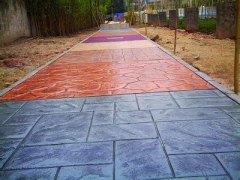 压模地坪拥有几十种标准颜色和十几种造型模具,通过复合着色技术可呈现天然石材的色泽及图案,如木纹、石块、古代砖、花岗岩、砂岩等,形成一种自然、轻松、古朴、有艺术韵味的艺术地坪系统。