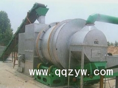 2、该机的主体部分为:与水平线略呈倾斜的旋转圆筒,烘干方式采用顺流式烘干。物料经供料装置从回转式转筒的上端送入,在转筒内抄板的翻动下(5~8r/min)与同一端进入的流速为1.2~1.3m/s、温度为700℃的热气流接触混合,滚筒中部设旋转的破碎搅拌翼,能使进入