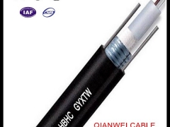 GYXTW 光缆结构是将250μm光纤套入高模量材料制成的松套管中,松套管中填充防水化合物。松套管外用一层双面涂塑钢带纵包,钢带和松套管之间加阻水材料以保证光缆的紧凑和纵向阻水,两侧放置两根平行钢丝后挤制聚乙烯护套成缆。
