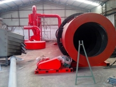 烘干流程:干燥的湿物料由皮带输送机或斗式提升机送到料斗,然后经料斗的加料机通过加料管道进入加料端。加料管道的斜度要大于物料的自然倾角,以便物料顺利流入干燥器内。干燥器圆筒是一个与水平线略成倾斜的旋转圆筒。物料从较高一端加入,载热体由低端进入,与物料成逆流接触,也有载热体和物料一起并流进入筒体的。随着圆筒的转动物料受重力作用运行到较底的一端。湿物料在筒体内向前移动过程中,直接或间接得到了载热体的给热,使湿物料得以干燥,然后在出料端经皮带机或螺旋输送机送出。