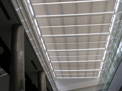 FTS天棚帘特别适用于普通电动卷帘无法安装的弯曲、倾斜的场合,整个系统由驱动系统、面料和控制系统三部分组成,驱动系统采用2个FTS专用管状电机,分别安装在两条卷管中,面料一端固定在其中一条卷管上,固定面料另一端的钢丝绳卷曲在另一条卷管的卷绳器上。这两台电机通过一个专用的控制器协调工作,其中一台电机提供面料运行的动力,另一台电机的刹车同时工作,提供一定的阻力拖住面料,避免面料下坠,天棚完全打开后,面料会卷在其中一条卷管上,运行中或停止时面料均有张力,可制作大面积的平面或弧形面的天棚帘系统。