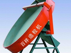 圆盘造粒机由大盘、大齿轮、传动部分、机架、底座、刮刀架、无动力刮刀等组成。造粒盘盘角采用整体圆弧结构,成粒率可达93%以上。造粒盘设有三个出料口,便于间断生产作业,大大降低了劳动强度,提高了劳动效率。