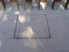 新型隐形井盖,由井框、井盖组成,井盖设计为方形的凹槽。其剖面也可为倒梯形,这样可使井盖与井框的配合更加紧密,改善了目前井盖的不足,隐形井盖只在地表面暴露四边边框,井盖的中间凹下一定深度,凹面的底部设计为弧形,凹面上设有加强筋。轻型隐形井盖为钢板结构,表面直接可铺贴地砖。本结构的井盖可以与周围环境和谐地融为一体,可根据不同的环境,在隐形井盖内填充不同的材料,是整个井盖百分之九十五的面积和周围环境相同,达到隐形的目的,可广泛用于机动车道、高速公路、城市人行道、草坪和花池等各种地平面出口处。