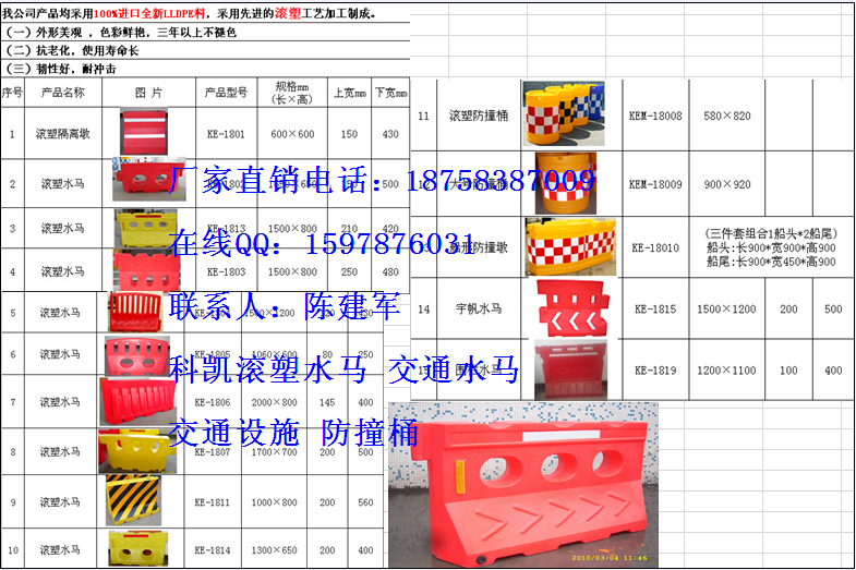 司主营产品滚塑水马、交通水马塑料水马防撞墩、高围栏水马、滚塑防撞桶、大号圆形防撞桶、滚塑隔离墩、塑料注水路墩小水马、船形防撞桶、组合式防撞墩、市政施工水马、施工围挡围栏、高速防撞水马、道路隔离水马、交通路障防撞桶水马等交通设施水马防撞桶系列产品,其均采用全新进口PE滚塑成型工艺生产制作