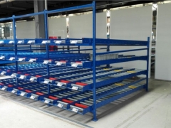 辊筒式货架又叫重力式货架, 属于仓储货架中的托盘类存储货架。辊筒式货架是横梁式货架衍生品之一,货架结构与横梁式货架相似,只是在横梁上安上滚筒式轨道,轨道呈3-5°倾斜。托盘货物用叉车搬运至货架进货口,利用自重,托盘从进口自动滑行至另一端的取货口。辊筒式货架属于先进先出的存储方式。