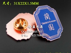 主要工艺有:蚀刻(咬板)、压冲、注漆(填油)、拉丝、丝印、平印、喷漆、电镀、滴胶、仿珐琅、锌合金