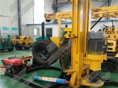 HQZ150D打井机采用挖掘机履带底盘,越野性能强。独立的模块设计,可使钻机装在卡车上,增加其机动性。两档回转和推进速度可满足在土层和岩层的不同穿凿需要。组合式的定位器,可根据不同型号的钻杆和冲击器进行调整更换定位盘,保证定位定心准确、可靠。卷扬机构方便钻杆和冲击器的吊装,降低劳动强度。