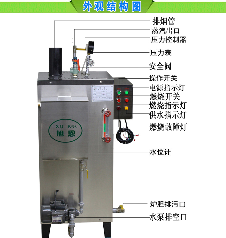 5、安全:整机严格按照《蒸汽锅炉安全技术监察规程》制造,保证用户拥有放心可靠的产品。具备齐全的多项保护功能,缺水保护、接地保护、蒸汽超压保护等,锅炉自动保护。