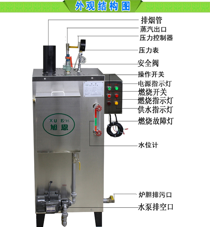 5、安全:整机严格按照《蒸汽锅炉安全技术监察规程》制造,保证用户拥有放心可靠的产品。具备齐全的多项保护功能,缺水保护、接地保护、蒸汽超压保护等,锅炉自动保护。