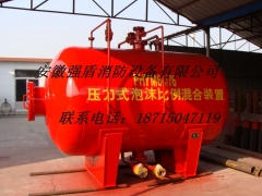 压力式泡沫比例混合装置,由泡沫罐、胶囊、压力式比例混合器、进水管、安全阀、控制阀门及一些辅助零部件等组成。当压力水流经过该装置的比例混合器时,比例混合器将其按比例分流,其中一小部分水进入带胶囊的泡沫液储罐夹层,挤压胶囊,能使水与泡沫液(泡沫灭火剂)按 6%或3%的比例进行自动混合。输出的泡沫混合液供泡沫产生的喷射设备(泡沫罐、泡沫枪、消防炮等)产生空气泡沫进行灭火。体积1-15立方米,容积1000-15000L,流量10-96(L/S)。
