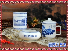 陶瓷茶杯 看着开心,喝着更舒心。洗茶,喝道茶叶的浓香,精华。(一杯茶)、(一根烟)、(一支笔)既是一份逸致,也是一份潇洒,青花三件套(茶杯、烟灰缸、笔筒)又名“吉祥三宝”,聚欣赏、收藏、实用为一体,是有中华文化特色的陶瓷礼品之一。我公司大量生产供应各类规格画面的骨瓷茶杯,可根据您需要印制的各种图片、公司LOGO图形和文字等来设计定做。我们拥有一流的设计人员和经验丰富的制作团队,可为客户量身定制不同质地和风格的陶瓷工艺礼品。您的创意我来实现,欢迎国内外客户洽谈定制,共创精品陶瓷,同享美好生活!