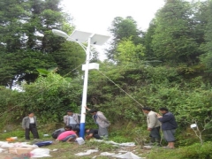 - 欢迎咨询:18061838208(李经理) 株洲太阳能路灯批发零售 1、蓄电池组装:核对蓄电池容量与设计配置单是否相同(若多块组件,请确定并串联方式,并联电池不能超过4块)。蓄电池连接线接线时,注意连接线鼻子焊接点牢固。将连接好的电池装进蓄电池保温箱中,封闭保温箱,同时注意在组装时将保温箱各处螺丝紧固好,避免露水; 将组装好的蓄电池盒,置入蓄电池坑中,盖好盖板(或者直埋于土里);蓄电池入坑过程中最好选择在晴天;入坑后将连接线引出坑基础,测试电压是否正常,否则进行检查。 2、电池板组装:组装前将电池板支架与灯杆搬运至基础附近,将电池板用螺丝固定在架子上,按要求对电池板实行并串连接线,接线完闭后进行测试,确保电压符合安装要求。正常天气情况:12V系统电池板系统测试电压不能低于18V,24V系统电池板测试电压不能低于36V。若小于要求检查电池板电压是否符合要求。 3、灯杆组装:检查确定所安装位置灯杆型号是否正确(如单头,双头),配合相应的长短挑臂;将合适的导线裁至相应的位置,一般剥线两端各预留150MM。安装跳臂及灯头,确定灯具的位置及水平度,以灯杆为基准。接线后检查灯线是否紧固牢固。连接光源与穿线,按说明书正确连接导线,注意正负极。连接完线后要检查连接是否牢固。光源安装过程中,注意光源的投光面要垂直于地面,而不是安装的挑臂面。 连接完光源后,先用万用表测试其阻值,及与杆体有无接地现象,后使用蓄电池对其进行亮灯测试,确认连接正确。 4、吊装:待灯杆部件都安装完后,并对光源检测完后,可进行吊装。吊装前要准备好相应的材料工具:自喷漆、活口扳、加力杆,锤子,内六方,螺母,垫片等。先对基础表面进行清理,便于安装。先装杆体起吊于1米以上,此时对电池板进行整体方向调整固定。(调整时根据地区太阳方向,调整至南方,且紧固牢固),同时对杆体上污垢进行清理,并对局部擦碰严重地区进行补漆处理。起吊过程中,注意杆体移动方向与速度,由专人用板手扶住灯杆,避免碰伤人员。在杆体下降过程中要缓慢,并有专人指挥吊车司机,严禁多人乱喊指挥。注意在起吊系扣时要防止起吊后绳索无法取下,必要时可在系绳上面再系一绳,便于取绳。灯杆落下时注意,不要压住蓄电池管线,同时要缓慢下降;螺丝紧固时要对称紧固,M24以上的螺母要使用加力杆,力杆长度不小于2米。四脚受力要均匀,保持杆体正直。株洲太阳能路灯批发零售 株洲太阳能路灯批发零售威太阳能路灯主体材料:灯杆为全钢结构、整体热镀锌/喷塑处理 2、太阳能电池组件:晶体硅10-200WP(按负载配置) 3、太阳能路灯系统工作电压:直流12V/24V 4、太阳能路灯控制器:太阳能灯具专用控制器,光控+时控,智能控制(天黑灯自开,天亮灯自熄灭) 5、太阳能路灯储能电池:全封闭免维护铅酸蓄电池12V 24—200Ah(根据负载配置) 6、太阳能路灯光源类型:节能大功率LED路灯灯头,10-180W(可按客户要求配置) 7、太阳能路灯防护等级:IP65 8、太阳能路灯使用温度:-30度至70度,抗风力≥150Km/h 9、太阳能路灯照明时间:4~14小时(可根据需要调节) 10、太阳能路灯灯杆高度:4米~10米(可以按客户要求制作) 11、太阳能路灯阴雨天保证:可连续工作3~5个阴雨天(区域/季节不同有差异)利用得天独厚的自然能源优势,融入新科技成果,节能、安全、低廉的低碳环保太阳能路灯正在改变着当代中国的承建管理理念,假以时日,便可以照亮我国农村建设的新道路。 新农村建设太阳能路灯参数 *主体材料:灯杆为全钢结构、整体热镀锌/喷塑处理 *太阳能电池组件:晶体硅40-200WP(按负载配置) *系统工作电压:直流12V—24V *控制器:太阳能灯具专用控制器,光控+时控,智能控制(天黑灯自开,天亮灯自熄灭) *蓄电池:全封闭免维护铅酸蓄电池12V38Ah—200Ah(根据负载配置) *光源类型:节能高功率集成LED,(可按客户要求配置) *使用温度:-30度至70度,抗风力≥150Km/h *照明时间:4~12小时(可根据需要调节) *灯杆高度:4米~8米(可以按客户要求制作) *阴雨天保证:可连续工作4~5个阴雨天(区域/季节不同有差异)(可按客户要求制作)株洲太阳能路灯批发零售 株洲太阳能路灯批发零售市场欢迎咨询:18061838208(李经理) 企业简介: 扬州汉威光电科技有限公司坐落于中国历史文化名城扬州北郊送桥镇工业园区,这里是中国路灯制造基地(由国家照明电器协会2008年授予),道路照明灯具产业集群是江苏省百个重点产业集群之一。本公司是一家专门从事户外照明产品研发、生产、销售、安装及服务于一体的新能源生产企业,本公司主要致力于研发生产太阳能路灯、LED路灯、风光互补路灯、高杆灯、中华灯、庭院灯、景观灯、监控杆、交通信号灯等户外照明产品及系列光伏产品。公司占地面积10000多平方米,拥有1200吨大型折弯卷杆设备、全自动数控并口焊管机、全自动喷塑流水线一条、自动埋弧焊机、焊接探伤设备、等离子切割机、校直机、LED组装设备一流的生产设施及光伏组件生产设备层压机一台,年生产能力15万套,产品畅销全国各地。 公司不断努力,不断发展壮大,已跨入了现代化照明生产企业行列,已被工商部门授予重合同守信用单位、资信等级为AAA级企业和江苏省建筑灯具推荐品牌。本公司产品已通过ISO9001、ISO14001、GBT28001、3C、CE、CQC等多项认证. 企业秉承:品质为先,以人为本,品质铸就品牌,人才创造未来,专业专注,技术