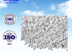 缘江牌-活性氧化铝双氧水用5-7毫米本品为白色、球状多孔性物质;无毒、无臭、无味、不溶于水、酯、烃、醇、等有机溶剂,具有在水和碱中不粉化、不变软、澄清度高,使用寿命长,对蒽醌衍生物降 解和再生能力强等优点,是蒽醌法生产双氧水的专用吸附剂。本产品除吸附工作液中的碱以外,对氢化降解物有很强的再生能力,可将氢化反应中增加的降解物转化 成有效蒽醌,保证了总有效蒽醌量的稳定,有利于氧化反应的进行,并减少了蒽醌的添加量,节约了运行成本。同时,考虑到再生的需要,双氧水用氧化铝保证了良 好的机械性能,再生后的活性变化较小。