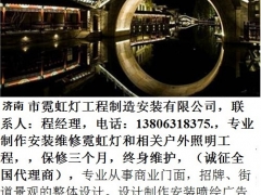 济南市霓虹灯工程制造安装维修有限公司,联系人:程经理,电话:13806318375.,专业制作安装维修霓虹灯和相关户外照明工程,,保修三个月,终身维护,(诚征全国代理商),专业从事商业门面,招牌、街道景观的整体设计。设计制作安装喷绘广告牌,灯箱,LED灯饰,霓虹灯,电子显示屏,单立柱,楼体光亮工程等等,是户外视频专业制作安装公司。.更多详情,登陆:公司网站:http://www.7friends.com.cn/index.php?homepage=jinannihong&update=1,,,, 济南市霓虹灯工程制造安装维修有限公司在威海市区,文登区,荣成市,乳山市及烟台芝罘、福山、牟平、莱山4个区及长岛县,龙口、莱阳、莱州、蓬莱、招远、栖霞、海阳,,青岛,潍坊,淄博,德洲, 东营,济南等地制作安装了大量优质的户外照明广告牌,获得客户们的赞誉和褒奖。我公司注重将崭新的照明科技产品运用到工程当中,设计突出客户行业特点,起到很好的宣传效果,突出了客户正面形象,为客户们带来良好的广告效果和经济效益。霓虹灯是户外广告的主要形式之一,为企业和单位主体建筑在夜幕中增加色彩和动感,展现公司企业积极向上开拓进取的精神风貌,时代感强烈。同时为所在街道的夜晚增加靓丽的风景,特别是重大节庆日的夜晚,更能体现会说话,有感情的建筑。装饰霓虹灯时,设计安装的画面体现公司,单位性质可以很好的提升企业形象,为客户留下深刻的印象,为扩大业务打下良好的基础。, 霓虹灯一般分两大类: 1、静态灯,颜色固定,各部分不变化;