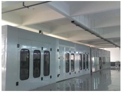 对于地盘式生产线或悬挂式生产线的烤漆装置,需将加热器安装在带有输送线的烘道中。烘道形式可以是单输送线通过的隧道,也可是输送线迥转往复的烤漆房。涂饰好的零部件送进烘道中,由输送线带动,从烘道一端输送到另一端。在输送过程中,使涂层逐渐被加热,从而获得较好的干燥质量。一般将整个烘道分为低温区、高温区、中温区。让涂饰好的制品先经低温区,使涂层自然流平、涂料中的部分溶剂自由挥发,接着进入高温区加速涂层干燥,最后再经中温区继续干燥直到涂层固化。要根据地盘生产线长度、运动速度、涂层固化的时间、企业产品等因素综合考虑烤漆房的内输送线的长度,连续式干燥装置的干燥效率比周期式的要高,并有利于涂饰机械化和自动化施工。