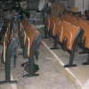 座椅/靠背/写字板:座椅靠背采用多层热压胶合贴木皮喷漆面(或可改用耐火板耐磨面),写字板采用防潮芯E1级刨花板贴三聚氰胺耐火饰面板贴面PVC封边处理;