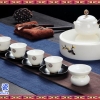 陶瓷茶具的品种很多,按材质化分可分为两种:瓷质茶具,陶质茶具。其中瓷质茶具主要的有: 青瓷茶具、白瓷茶具、黑瓷茶具和彩瓷茶具。这些茶具在中国茶文化发展史上,都曾有过辉煌的一页。陶瓷茶具 陶瓷茶具图片 定做茶具价格 茶具礼品套装景德镇陶瓷茶具 功夫茶具套装 礼品茶具景德镇大茶盘茶具 双龙戏珠陶瓷茶具 高档茶具套装景德镇陶瓷茶具有坯质致密透明,上釉、成陶火度高,无吸水性,音清而韵长等特点。因色泽洁白,能反映出茶汤色泽,传热、保温性能适中,加之色彩缤纷,造型各异,堪称饮茶器皿中之珍品。加之景德镇茶具造型精巧,装饰典雅,其外壁多绘有山川河流,四季花草,飞禽走兽,人物故事,或缀以名人书法,又颇具艺术欣赏价值,所以,使用最为普遍。明代,景德镇生产的青花瓷茶具,诸如茶壶、茶盅、茶盏,花色品种越来越多,质量愈来愈精,无论是器形、造型、纹饰等都冠绝全国,成为其它生产青花茶具窑场模仿的对象,清代,特别是康熙、雍正、乾隆时期,青花瓷茶具在古陶瓷发展史上,又进入了一个历史高峰,它超越前朝,影响后代。康熙年间烧制的青花瓷器具,更是史称“清代之最”