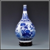 手绘青花瓷瓶中青花又称白地青花瓷器,是应用天然钴料在瓷胎上绘画,然后上透明釉,在高温下一次烧成的釉下彩瓷器,花面呈蓝色花纹,素雅美观,呈色稳定,不易磨损,图案精美,物件造型之独特。