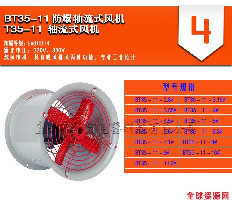 本系列风机适用于输送易燃易爆无腐蚀性气体,环境温度不得超过60℃。 广泛应用于一般工厂、仓库、办公室、住宅内通风换气或强暖气散热,也可在较长的排气管道内间隔串联安装以提高管道中的压力 ,卸下电机可做自由风扇。防腐轴流式风机(FT35-11型)采用防腐材料外涂环氧漆加工而成,电机采用特种防腐电机用于输送有腐蚀性气体。防爆轴流式风机 ( BT35-11 ) 型,用于输送易燃易爆的气体。叶轮由铝合金加工而成, 以防止在运转中引起火花, 电机采用隔爆型电机。FT35-11型和BT35-11型风机的性能参数和外形尺寸均同T35-11型风机一样。风机需带支架脚和电机电压,请订货时注明。