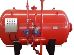压力式比例混合装置是用来存储泡沫液并通过压力式比例混合器利用消防泵组的供水将泡沫液置换出来,并与供水按一定的比例混合形成泡沫混合液的装置。