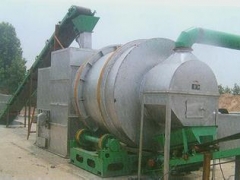 2、该机的主体部分为:与水平线略呈倾斜的旋转圆筒,烘干方式采用顺流式烘干。物料经供料装置从回转式转筒的上端送入,在转筒内抄板的翻动下(5~8r/min)与同一端进入的流速为1.2~1.3m/s、温度为700℃的热气流接触混合,滚筒中部设旋转的破碎搅拌翼,能使进入