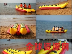 顾名思义,所谓的香蕉船真的很像一根大香蕉,它是一个色彩很鲜艳,样子很特别的香蕉型气垫船。当一台大马力的水上摩托艇拉着它时,香蕉船就变的疯狂了。香蕉船是一个新兴的海上娱乐项目,骑上香蕉船随着快艇的速度,犹如一匹脱缰的野马自由穿梭在碧蓝的大海之中。