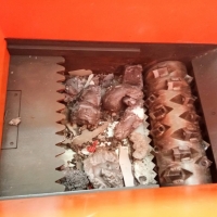 由于机头料又厚又硬,加工起来非常麻烦,我公司最进研发的机头料单轴撕碎机,撕碎破碎一体机,可直接把机头料投入机器,一次性加工成要求的小片状。