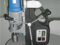 磁座钻的构成部分主要有电机、磁座、齿轮箱、控制电路等,使用的电压是单相220伏特,但功率大,如800、1000的功率达到1800W,最少的400都有1050W。而重量,相对于其它同功率的磁座钻来说,是比较轻的,这台800只有25公斤,1000也只有36公斤。在调速方面,400,450,850是用档位调速,其它型号的磁座钻都采用两档的无级调速,无级调速是百得磁座钻所特有的功能,无级调速的好处在于不用停机就可以改变转速。I档是低速档,II档是高速档,以800和1000为例,其I档的转速是40-140转/分,II档的转速是120-480转/分,转速的选用可查『使用说明书』里面的转速对数表,一般来说,钻头直径越大,选用的转速就越低。