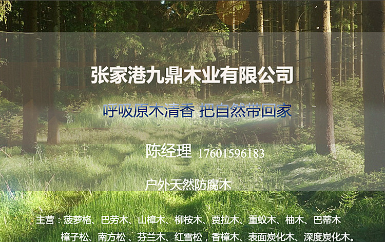 张家港九鼎木业主要经营:菠萝格,印尼菠萝格,非洲菠萝格,马来西亚菠萝格,贾拉木,柳桉木,银口木,梢木,巴劳木,巴蒂木,山樟木,柚木,红铁木,红雪松,碳化木(炭化木),大绿柄桑,圆盘豆,阻燃木,花旗松,防腐木,南方松,芬兰木,赤松板材等一系列世界名贵木材。