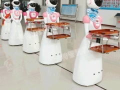 餐厅地面预先设置好引环形引导线,在传菜口工作人员把做好的菜放在机器人托盘上,并设置目标餐桌。机器人自动根据预设的地图,一路运行到目标餐桌,并提醒顾客取餐。机器人自带避障装置,当机器人送菜过程中,引导线前方有障碍物,例如有个孩子在机器人前方。机器人自动停止,并语音提醒前方人员让开。当前方障碍人员让开以后,机器人继续送菜。