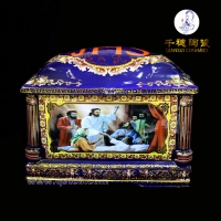 我厂千穗陶瓷生产的棺型陶瓷骨灰盒工艺精湛、造型美观,大小规格齐全,画面款式多样,价格适中,并且能够接受个性化定制,可将逝者图像直接印制在陶瓷棺材上,还可在现有陶瓷棺材上添加更多个性文字或图案,以此寄托对逝者的哀思。