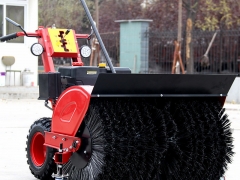 手推式扫雪机由中型卡车或重型卡车、四缸汽车发动机、吸 雪管、鼓风机、排雪管、吸雪口、吸雪口液压升降装置、 旋转式清扫刷、清扫刷连杆、固定架、 清扫刷液压升降装置组成。