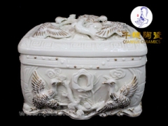 金色陶瓷骨灰盒是采用粉彩技术,整个骨灰盒外表都呈现高贵奢华金,金色陶瓷骨灰盒也可以接受客户来样logo定做,满足各种客户的需求。金色陶瓷骨灰盒可以在上面加上逝者的头像等,由于陶瓷材料来源丰富、廉价、艺术造型容易、易于工业化生产,产品显得华贵。