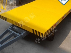 本平板拖车承重4T,带撞刹机构,可实现停车制动,可用于工厂、仓库、港口、码头等场区内大宗货物货物周转运输。zy17