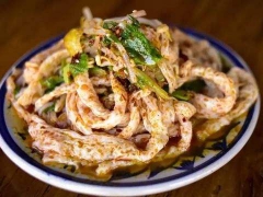牛筋面是中国中西部地区的汉族特色小吃之一。口感软滑,筋道,后味醇香。吃法多样,春夏秋3季主要是凉拌,冬季热炒或者下在汤中。一种小吃 机器压制而成,表面有细泡,口感有筋度,所以得名---牛筋面。用辣椒油,或芝麻酱,香油,牛肉酱等调味品拌制而成的面食。