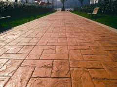 从一个边缘开始,排放第一块模板,施工人员用夯实器或人站在压模板上均匀将重量传递到混凝土表面上。将模板上的纹理压印在混凝土的表面,然后将第二块模板紧靠在第一块模板的边缘,如前所述,夯压模板。当压模地坪板全部放在混凝土上时。将第一块模板拿起,放在最后一块模板的边上,重复以上夯压顺序,直到完成整个表面的纹理压印。压模时应保证所有模板的顶面齐平,以保证压印纹理的深度统一;脱模时,应垂直拿起,否则会损害已压印的纹理。在压纹过程中如遇到墙柱等障碍物,硬模板不适用时,应采用软压模板,压纹方法仍同前述。如压印的勾缝有不自然时,用勾缝工具进行修补。