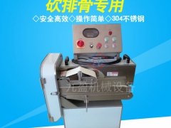 新型斩排骨机TJ-303A,此机是本公司自行研发、设计的一款新型斩排骨机,采用特制双刀能将龙骨,猪蹄,猪小排大排等带骨物料,将横条状的排骨切成块,长短可调。