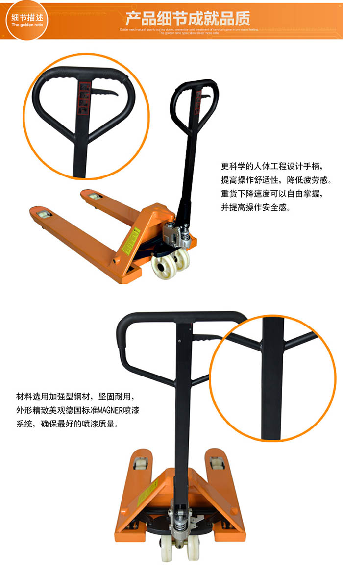 超短型搬运车属于异型搬运车。采用优质钢板,精心打造,内部溢流阀有效避免超载使用,降低维修费用。一体式铸造轮架,配置双前轮,推动灵活平稳,尤其在狭窄的空间使用,亦能转动自如,是小空间仓库的搬运好帮手。内部溢流阀结构。超短型异型搬运车货叉长度为500mm、600mm、700mm、800mm、900mm等几种规格。货叉外宽为550/685mm。