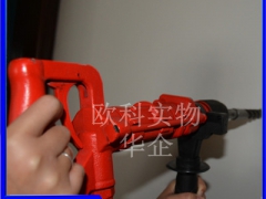 QCZ-1气动冲击钻由柄体、压柄、气缸、机头、推杆等组成。压气由气管连接管接头进入压柄进行气量调节而进入气缸,再由推杆调节行成冲击回转或单纯冲击,从而达到冲击或回转的作用