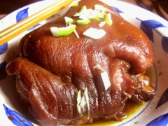 秦逸生附记:原料必须新鲜,不然腥味去不掉,用高压锅时,先用清水把肘子煮开几分钟,把水倒掉,洗净肘肉,再放清水和调料(可加些糖、一点点醋以没有酸味为度、一个辣椒)盖阀上气三十分钟,即可食用。有工夫开盖收干汤汁更好。用此法酱猪蹄亦佳。