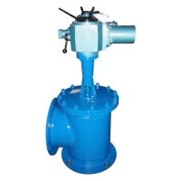 由液压缸和角式截止阀组合而成,液压缸内动力带动瓣升降,使阀体通道开或闭,以达到流体通断。本产品用于自来水公司或其他公司的各类水池,通常成排安装在沉定池底部外侧壁,用以排除池底沉淀的泥砂和污物。该阀液压缸之活塞为L形皮碗,密封性能好,经久耐用,阀门密封副亦橡胶密封,无泄漏。