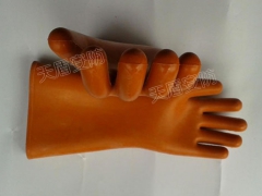 绝缘手套又叫高压绝缘手套,是用天然橡胶制成,用绝缘橡胶或乳胶经压片、模压、硫化或浸模成型的五指手套,主要用于电工作业。